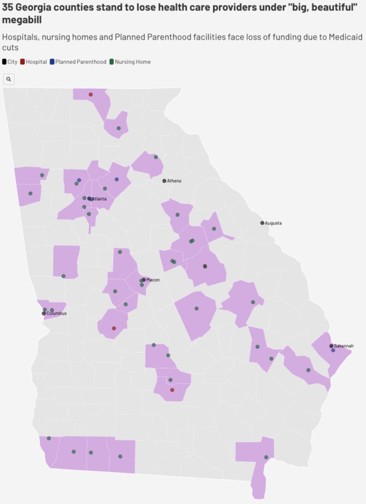 Other key components of the BBB include the expiration of the Affordable Care Act (ACA) marketplace tax credit, which is now central to discourse surrounding the government shutdown, as well as the more than 1 trillion dollars in cuts to Medicaid. Georgians are already facing highly inflated premiums as a result. According to a report from the Center for Healthcare Quality and Payment Reform, nine of Georgia’s rural hospitals are at risk of closing within the year as a result of the expiry and austerity reforms (while there have been nine hospital closures in Georgia since 2010).